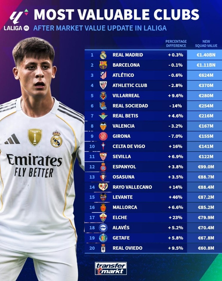 10月5日,德转更新了西甲球员的身价,并整理出了一份引人注目的身价排行榜。首先,占据榜首的是皇家马德里,身价高达14亿欧元,这使得他们无疑是西甲乃至欧洲最有价值的俱乐部。紧随其后的是拥有众多明星球员的巴塞罗那,身价为11.1亿欧元,依然是足球世界中的一支超级球队。