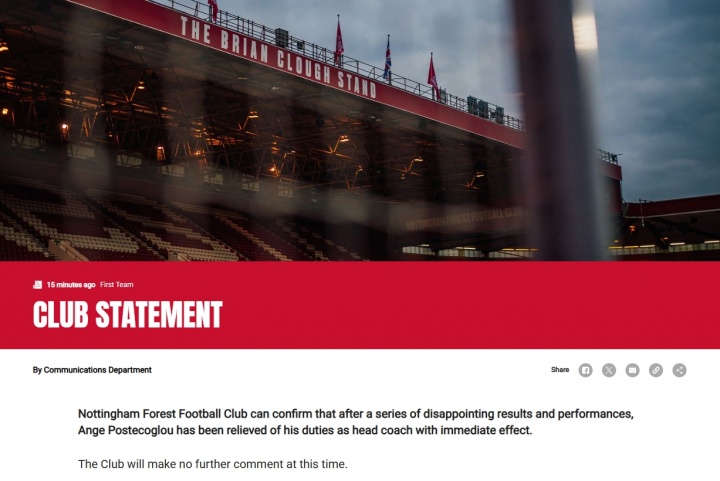 森林俱乐部宣布澳波下课通知 简洁明了仅39字 无感谢与祝好词汇_英超直播