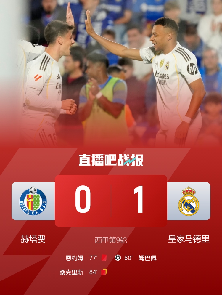 皇马一球小胜赫塔费 队伍两名球员染红姆巴佩制胜维尼修斯替补显威_西甲直播