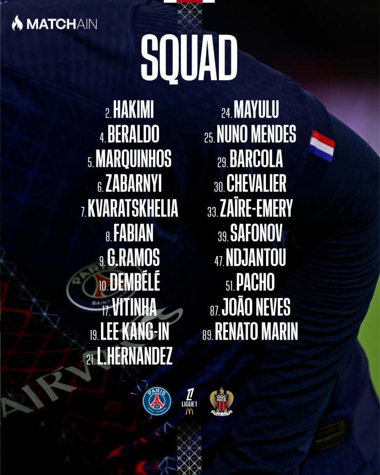 巴黎的球员名单中,门将位置上,舍瓦利耶、萨福诺夫和马林将为球队把守大门。在后卫线上,阿什拉夫携手贝拉尔多、马尔基尼奥斯、扎巴尔尼、卢卡斯-埃尔南德斯、努诺-门德斯和帕乔组成坚固的防线。中场方面,法比安、维蒂尼亚、马尤卢、扎伊尔-埃梅里和若昂-内维斯将共同把控比赛节奏,积极参与进攻和防守。