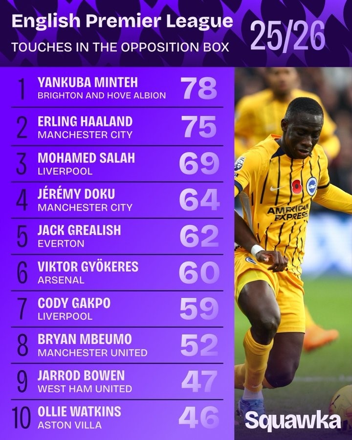 截至11月11日,英超联赛已进行11轮,squakwa对本赛季在对方禁区内的触球次数进行了统计,值得关注的是,布莱顿的扬库巴·明特以78次触球高居榜首,力压了众多明星球员。