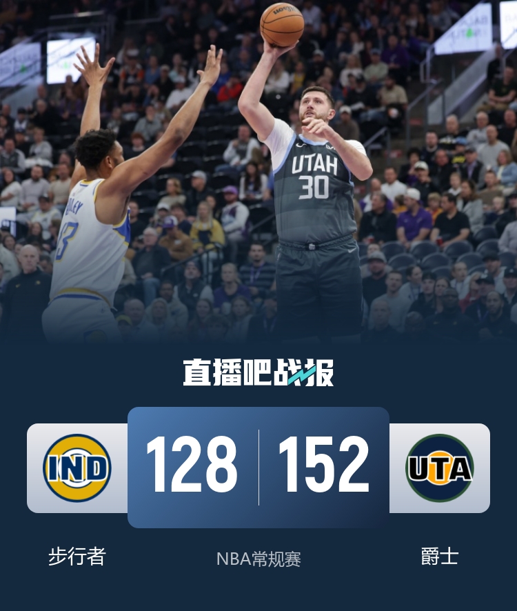 下半场,马尔卡宁继续火力全开,接连命中外线三分球,一口气为球队贡献了11分,进一步扩大了领先。爵士的外线火力全面开花,比赛的分差迅速拉开至20分。末节,爵士依旧保持着强劲的攻势,将领先优势稳稳控制在20分左右,步行者无力反击。最终,爵士以152-128战胜步行者,不仅终结了自己的连败,还让步行者遭遇了第五连败。