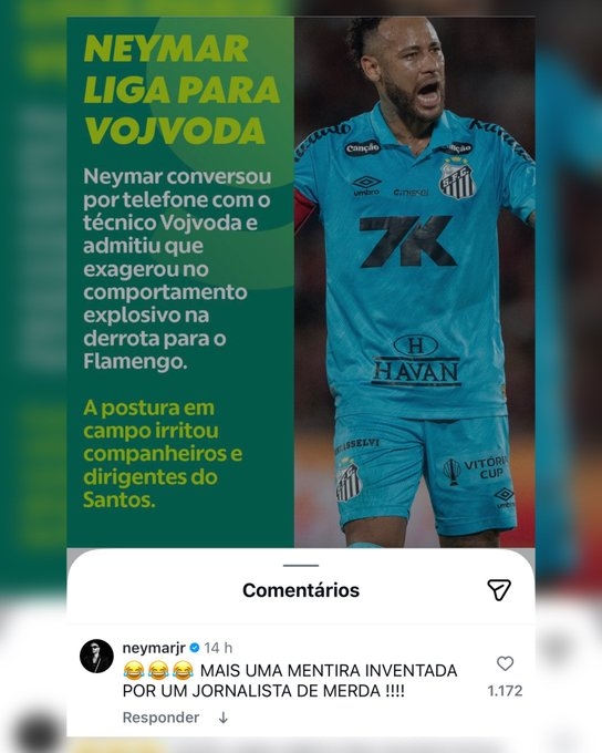 在这场巴甲联赛结束之后,有媒体报道称内马尔曾主动与沃伊沃达进行沟通,承认自己在比赛中的过激表现确实不当。然而,内马尔在Instagram社交平台上的评论区回应道:“这是某个无良记者捏造的谎言。”他对此类报道表示强烈反对,并坚称并没有与教练就比赛态度或言论进行任何交流。