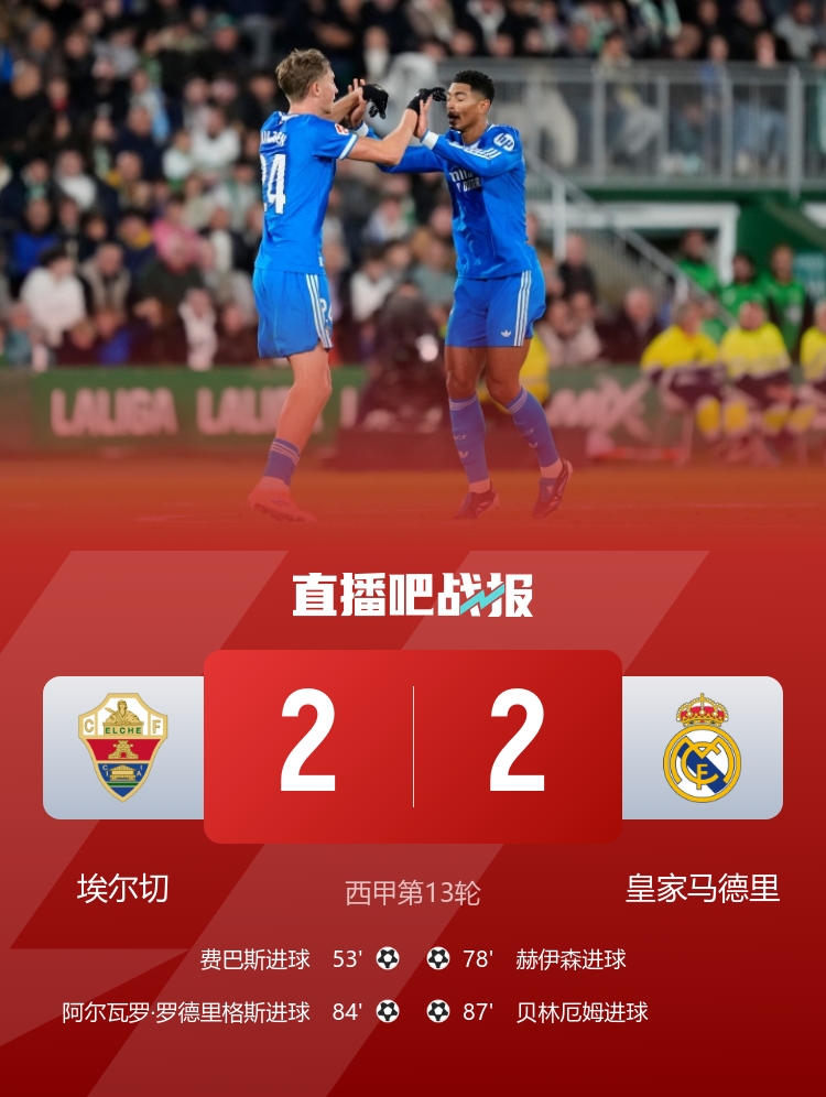 平局拉锯战 皇马与埃尔切鏖战两回合 贝林厄姆传射助力赫伊森破茧而出_西甲直播