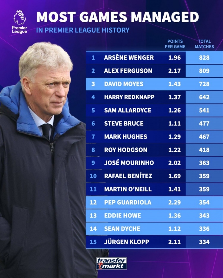 英超教练执教场次榜单更新:莫耶斯728场位列第三 势将追赶弗格森与温格_英超直播免费观看