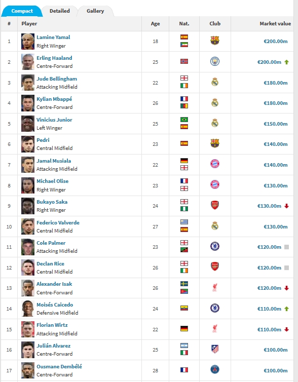 - 巴萨的亚马尔以2亿的身价领跑,佩德里的身价为1.4亿