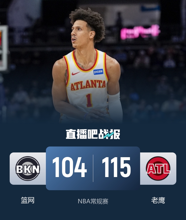 老鹰队逆转战胜篮网队 送对手四连败 约翰逊贡献26分12篮板4助攻 小波特得到18分7篮板6助攻_NBA直播