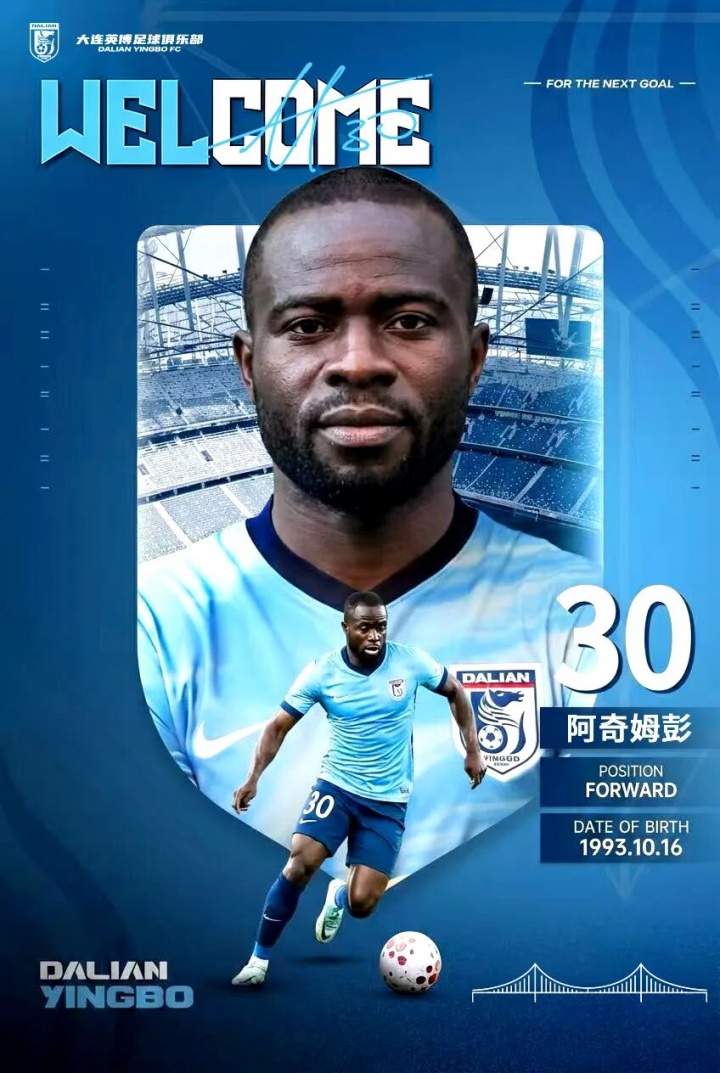 前河南外援阿奇姆彭正式加盟大连英博 上赛季表现出色34场贡献15球5助攻_中超直播