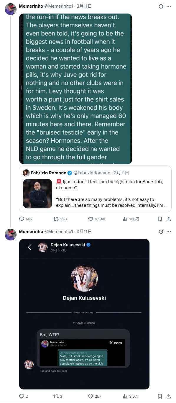 该谣言最初出现在一家拥有3000多粉丝的社交媒体博主的页面中,博主以分享热刺的梗图而闻名。该博主发布的虚假消息在短时间内惊人地获得了超过160万的浏览量,内容称库卢塞维斯基“再也无法踢足球”,并声称他因服用激素类药物而“于上周接受变性手术”。谣言中甚至提到,热刺对这些事情选择了“完全保密”。