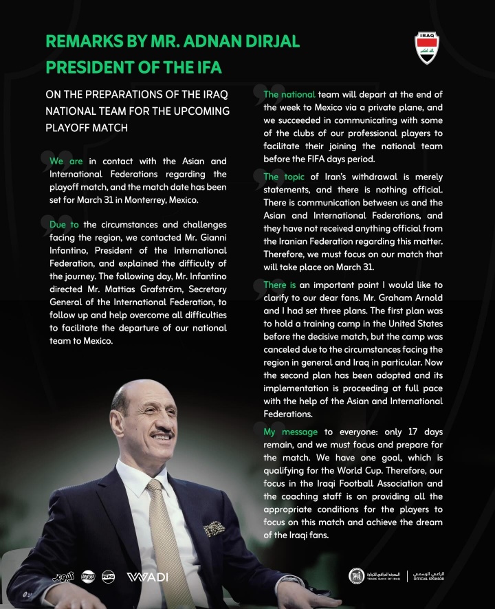 伊拉克足协主席达尔贾尔在3月14日的声明中确认,国家队将乘坐私人飞机前往墨西哥,以备战即将到来的世预赛附加赛。针对伊朗退赛的传闻,达尔贾尔强调球队未收到任何官方通知,并表示他们与亚足联及国际足联保持密切沟通。