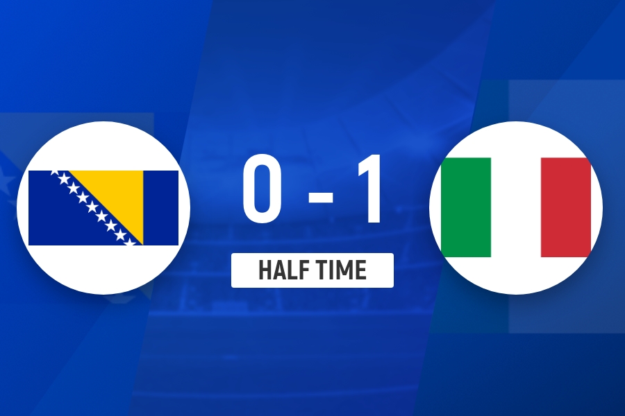 意大利在半场以1-0领先波黑 巴斯托尼被直红罚下 小基恩精彩兜射破门 巴雷拉贡献助攻_体育直播
