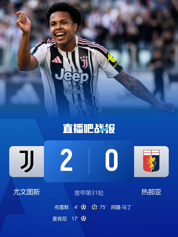 尽管热那亚奋力拼搏,最终还是未能改写比分。比赛结束,尤文图斯以2-0的比分顺利拿下热那亚,继续保持在意甲联赛中5轮的不败记录,与前四名的差距缩小至仅仅1分,而这场胜利无疑让尤文在激烈的争夺中更添信心和动力。